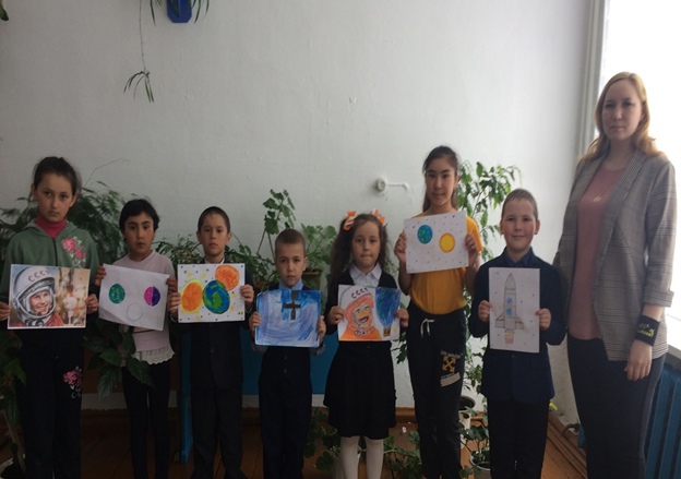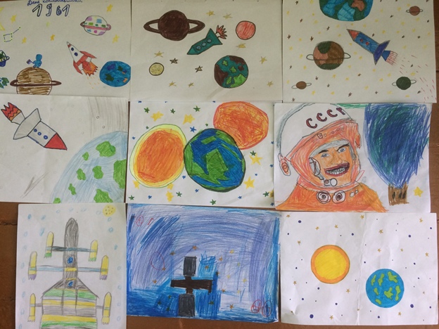 Уроки и тематические классные часы в начальных классах, посвящённые знаменательной дате, закончились выставкой рисунков «Дню космонавтики посвящается…»